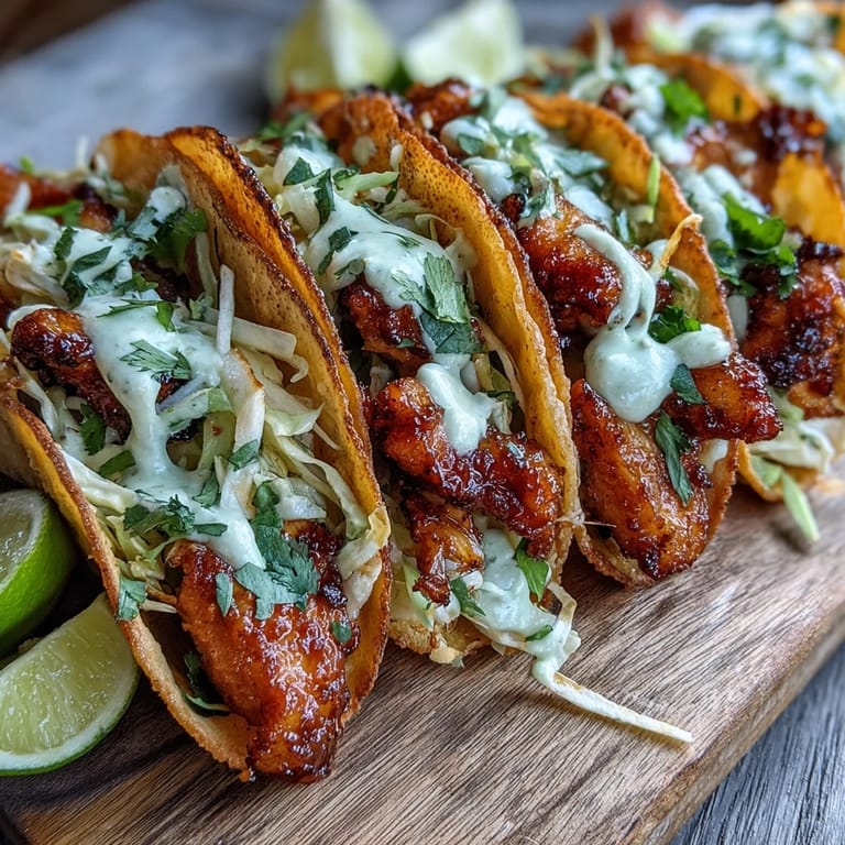 Save to Pinterest My friend showed up one night with a bag of wonton wrappers and a wild idea to fry them into taco shells. I laughed at first, but twenty minutes later we were standing over the stove, watching those thin squares puff and crisp into golden curves. The chicken was already marinating in the fridge from earlier that day, soaked in soy sauce and ginger. We stuffed those crunchy shells with smoky spiced chicken and tangy slaw, then drizzled everything with sriracha mayo. It was messy, loud, and absolutely perfect.
