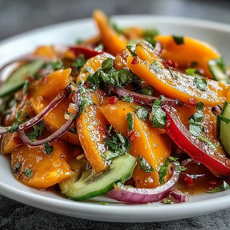 Save to Pinterest The first mango I ever peeled exploded all over my counter, sticky juice pooling under my cutting board and dripping onto the floor. I had no idea how slippery ripe fruit could be until I tried slicing one without a plan. That messy afternoon taught me to work slowly, let the knife follow the pit, and embrace the chaos that comes with tropical fruit. This salad was born from that lesson—equal parts patience and playfulness, with lime juice cutting through the sweetness like a sharp breath of summer air.
