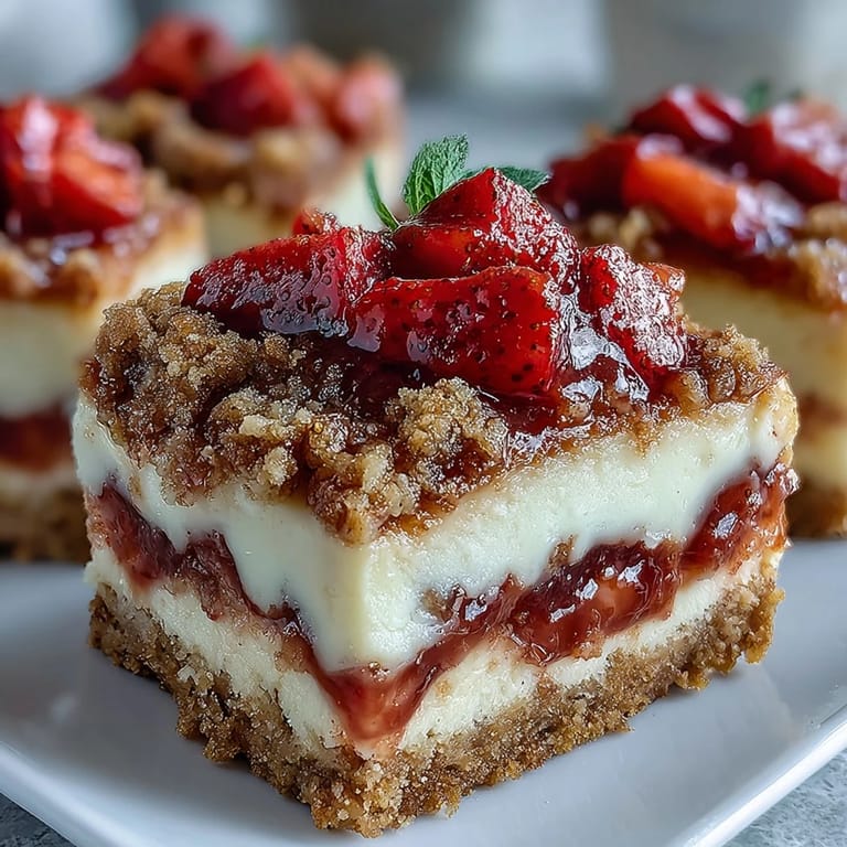Save to Pinterest My neighbor knocked on the door one Saturday morning with a basket of strawberries that were about to turn, and I panicked in the best way possible. I had guests coming that evening and no dessert plan. That's when I threw together these bars, layering everything I loved about cheesecake into something I could slice and serve without ceremony. The smell of cinnamon and butter filling the kitchen made me forget I was improvising.